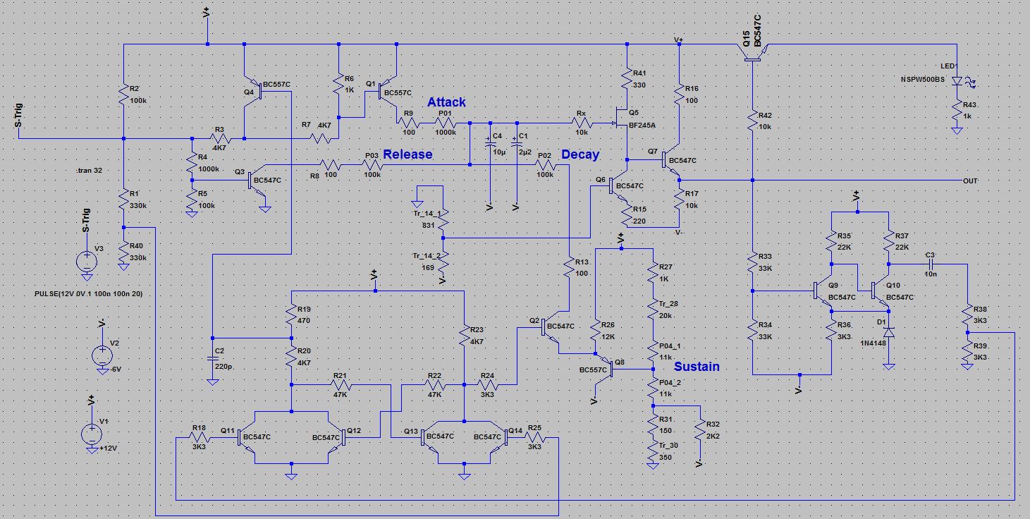 ADSR The envelope is initiated by a so called "STrigger" event, where a reference voltage within the 911 is shortened to ground (Shorted Trigger). This voltage drop initiates the ADSR process. The reference voltage is provided at the Cinch Jones connector at the lower left of the front panel (see Cinch Jones description below). This connector is usually connected via cable to a device which shortens the reference voltage to ground to trigger the 911 to start with the envelope process. These devices can be a keyboard, a sequencer or other devices which have the task to "play a note". The envelope starts with an "attack" phase, where the output voltage provided at the 1/4" phone jack at the lower right side of the 911 front panel rises from 0V to 6V in a time which is determined by the T1 pot at the top of the front panel. After the maximum envelope voltage is reached the 911 enters the "decay" phase, where the output voltage goes down again until the "sustain" level is reached. The sustain voltage is set by the fourth pot. The time which is needed to lower the output voltage to sustain level is determined by the second pot on the front panel, T2. This sustain voltage is kept until the STrigger event disappears, e. g. a key is released or a step sequencer stops running. After the STrigger event has stopped the "release" phase starts to lower the envelope voltage to 0 again. The duration of the release phase is determined by the third pot, T3. After the release phase is terminated the state of the 911 is "waiting for the next STrigger event". An LED on the upper right side of the front panel indicates the envelope output voltage by its brightness. The labelings of the T1, T2 and T3 pots indicate the time a phase lasts, from 2 msecs to 10 secs. This is not really usefull in the msec area as this is barely audible. And the 911 circuit is not the most precise, so the benefit of this labeling is doubtful. But for a rough orientation it's ok. The labeling of the sustain pot corresponds to the sustain voltage of the output envelope. |