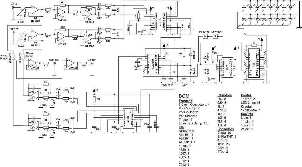 So habe ich mich mit Begeisterung auf einen Chipsatz von Wavefront Semiconductor gestürzt, der eine einfache Realisierungsmöglichkeit eines digitalen Effektgeräts versprach. Es handelt sich hier um drei ICs, nämlich dem Stereo ADC AL1101, dem DSP AL3201B und dem Stereo DAC AL1201. Leider gibt es die Dinger nur als SMDs, also mußte ich zum ersten Mal in meinem Leben mit meinen Wurstfingern SMDs verlöten (GRRRR!). Dieser Chipsatz ist übrigens in verschiedenen Alesis-Geräten wie dem Picoverb und anderen eingebaut. Ich habe das Modul weitestgehend mit der von Wavefront Semiconductor bereitgestellten Beispielschaltung des DSP - Evaluation Boards realisiert. Ich habe lediglich einen Programm-Switch (4520) und eine entsprechende Anzeige mit LEDs hinzugefügt. Das Modul verfügt über einen Stereo-Input (Links / Rechts) mit abschwächbarem Input. Der linke Eingang fungiert dabei als Master-In, falls man nur mit einem Signal arbeiten möchte. Er wird auf den rechten Eingang mit geschaltet, solange der nicht selbst verwendet wird. Mit dem Program-Taster können die Effektprogramme angewählt werden. Das Programm wird mit der entsprechenden LED angezeigt. Der DSP kann mit dem Reset-Taster zurückgesetzt werden. Die Stereo-Ausgänge verfügen über einen MIX-Regler, der das Ausgangssignal mit dem Eingang vermischen kann, um einen Effekt fetter oder dezenter zu verwenden. Sehr wichtig bei den verschiedenen Hall-Effekten. Auf den Einsatz eines Programmier- oder MIDI-Interfaces habe ich bei diesem Modul verzichtet, da ich erstmal Erfahrungen mit dem Klang der ICs und dem SMD-Handling sammeln wollte. Falls ich jedoch weitere Module dieser Art realisiere, werde ich vermutlich so etwas vorsehen. Der DSP wird mit 16 Effektprogrammen ausgeliefert, die man direkt und ohne weitere Parametrisierung verwenden kann: Delays: Hierbei handelt es sich nicht um reine Delays / Slapbacks, sondern um Echofunktionen. Das eingespeiste Signal wird im DSP "zurückgekoppelt", so daß ein Echo entsteht. Es werden zwei Verzögerungen, 125 und 190 Millisekunden bereitgestellt. Diese Effekte sind für mich neben den Reverb-Effekten die wichtigsten. Chorus: Hierbei werden die Eingangssignale zwischen den Ausgängen hin und her verpointert, so daß man den Eindruck mehrfacher Stimmen erhält. Die drei Chorus-Funktionen unterscheiden sich klanglich schon irgendwie, aber ich habe das noch nicht konkret an bestimmten Klangeigenschaften festmachen können. Siehe / Höre Sound Examples. Die Reverb-Effekte sind ziemlich dominant, wie ich finde. Hierbei ist die Mix-To-Out-Funktion sehr nützlich, mit der man den Effekt fetter machen oder abmildern kann. Dezent eingesetzt sind diese Effekte super, und dafür habe ich dieses Modul gebaut. Zusammen mit den Plate-Effekten erhält man ein recht breites Spektrum an verschiedenen Reverbs. Vocal Cancel: Habe ich noch nicht getestet. Obwohl es mich schon interessieren würde, wie so etwas funktioniert, halte ich desen Effekt für völlig sinnlos. Rotary Speaker: Soll irgendwie wie Leslie sein. Kann ich nicht beurteilen, da ich keinen besitze. Mit einem Dreieckssignal im Eingang klang der Ausgang irgendwie wie ein Akkordeon. Flanger: Schwer zu beschreiben. Am besten mal reinhören. Klingt irgendwie cool (wie ein Phaser). Room-Effekte: Lassen ein Eingangssignal wie in bestimmten Räumlichkeiten klingen.