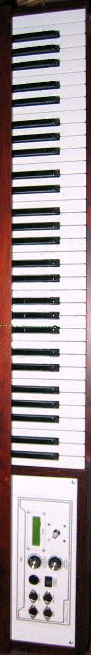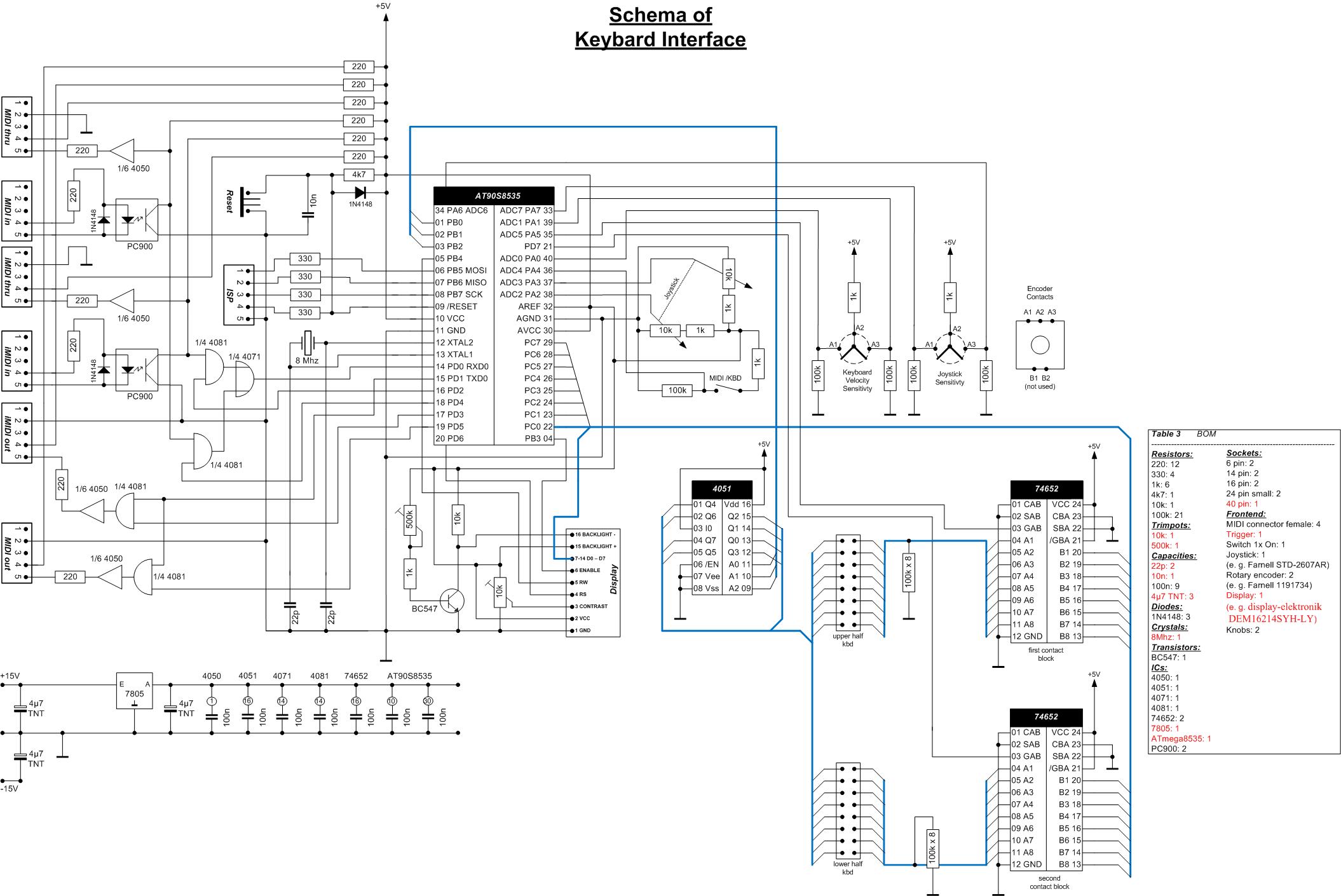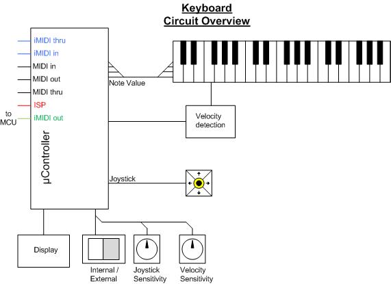 Die Schaltung besitzt als Kern den AT90S8535 µController von Atmel, der die Klaviatur 8-bit-wortweise abfragt, also immer 8 nebeneinander liegende Tasten. Da jede Taste zwei nebeneinander liegende Ausgangskontakte besitzt, die zeitversetzt schließen, ist es möglich, die Geschwindigkeit zu ermitteln, mit der die Taste gedrückt wird, und diese der MIDI - Notensequenz als Lautstärkebyte mitzugeben. Das tut der µController, wobei er die Geschwindigkeit anhand der KVS-Einstellung (KeyVelocitySensitivity) gewichtet (s. u.).