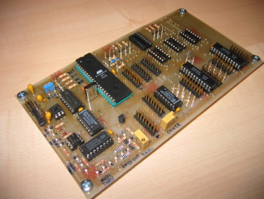 | Wie man unschwer erkennen kann, handelt es sich um einen Prototypen. Die vielen Stiftleisten dienen zum experimentellen An- und Abkoppeln der einzelnen Schaltungskomponenten an den Datenbus per Flachbandkabel.