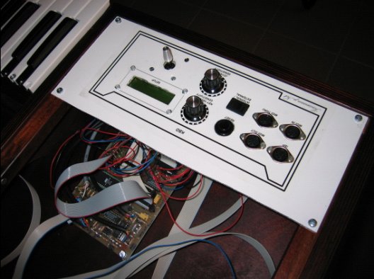 | In Betrieb ist auf der Platine schon mehr los, wie man sieht. Die vielen Flachband- und MIDI - Kabel haben diesen seltsamen Einbau nötig gemacht.