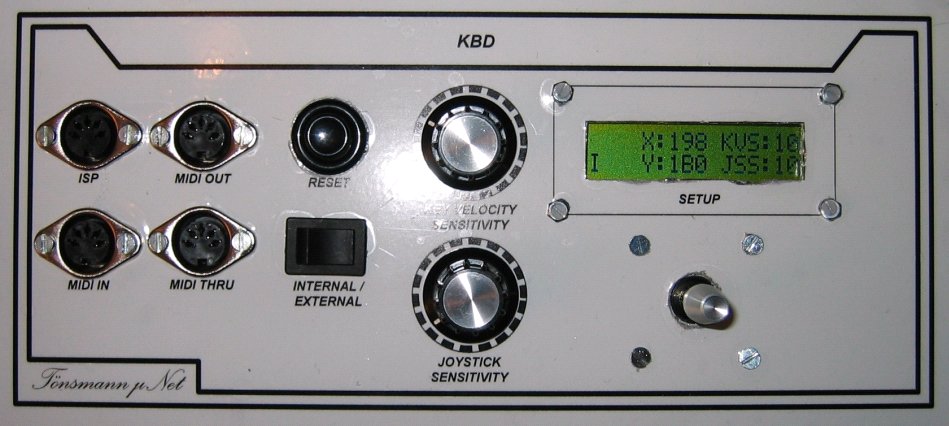 Als weiteres Eingabemedium steht ein analoger Joystick zur Verfügung, der von zwei AD-Kanälen des AT90S8535 mit je 10 bit Auflösung pro Achse (0 - 1023 bzw. 0x000 bis 0x3ff) abgefragt wird. Die Joystickpositionen werden derzeit in MIDI - Controllerchange-Sequenzen für die X-Achse und Pitchbend-Sequenzen für die Y-Achse umgesetzt.