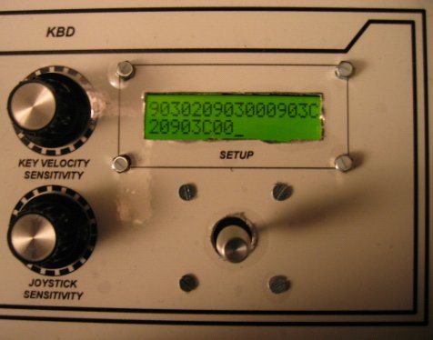 Die Joystickpositionen (X- und Y-Achse) sowie die eingestellten Werte für KVS und JSS werden auf einem zweizeiligen LCD-Display in Hexadezimalwerten angezeigt. Wird der Internal / External - Schalter auf External ('E') geschaltet, so dient das Display als MIDI - Monitor (siehe rechts). Hier wurden zwei Tasten des Formant nacheinander gedrückt und losgelassen. Zusätzlich werden die extern eingespeisten MIDI - Signale an den µNet intern weitergereicht und die eigene eingebaute Klaviatur abgeschaltet (Dieser Teil muss noch programmiert werden).