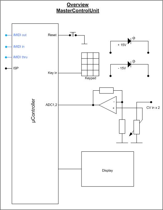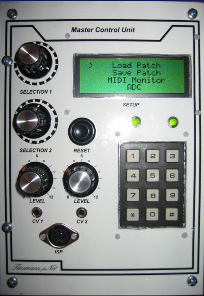 ![]() | Intro: This is - or better to say will be - the central controlling module of the uNet synthesizer system. The MCU controls and instructs all other modules via its serial current loop interface (like MIDI does), e.g. saving or loading module settings as patches. Beside this common operations also specific functions of dedicated other modules can be initiated by the MCU, although module settings can be done directly at the module of course, but remote control by the MCU is also possible that way. User interface: Two digital potentiometers (encoders) with push function have been built in to select menue items and functions. To select a menue item the encoders have to be turned, and a push invokes the selected function. To exit the function the encoder has to be pushed again, if not specified otherwise. Common data (like patch numbers) can be entered, edited and saved via the numeric keypad and the '*' and '#' keys. Additionally two analog inputs for voltages between 0V and 5V provided with level pots are included in the MCU. They are connected to two ADC channels of the central microcontroller and are converted to a digital value with 10 bit resolution for further processing. Also the Atmel ISP interface is implemented of course, as the software is still under development. And last but not least a reset pushbutton is provided, just in case... Extra: the two power indicating LEDs of the uNet power supply for the supply voltages +15V and -15V are integrated in the front panel. | ||||