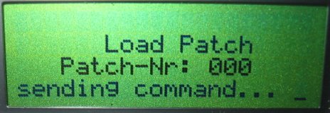 ![]() | Load Patch: Creates and sends a command to load the parameter values of all modules of the network. A 3 digit patch number can be edited via the little key pad. After pressing the '*' - key the command is sent to all modules of the network. | ||||