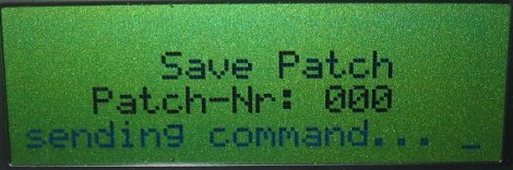 ![]() | Save Patch: Creates and sends a command to store all current parameter values to all modules of the network. A 3 digit patch number can be edited via the little key pad. After pressing the '*' - key the command is sent to all modules of the network. | ||||